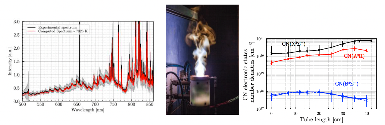 Titre : Cinétique et rayonnement des plasmas N2/CH4 hors-équilibre à haute température. La prédiction des transferts d’énergie entre un plasma de N₂/CH₄ et son environnement, ainsi que la caractérisation précise de son état thermochimique, constituent un enjeu majeur dans de nombreuses applications, telles que la conversion du méthane, le traitement de surface ou encore l’étude de la formation des tholins. Ces problématiques reposent notamment sur une description détaillée des mécanismes de dissociation et de recombinaison au sein des plasmas de N₂/CH₄.Le présent travail se concentre plus particulièrement sur le cas de la rentrée atmosphérique sur Titan. Dans ce contexte, le dimensionnement du bouclier thermique de la sonde requiert une estimation fiable des flux convectifs et radiatifs générés par le plasma. Toutefois, l’évaluation du flux radiatif demeure aujourd’hui entachée d’incertitudes significatives, que cette étude vise à analyser et à réduire.